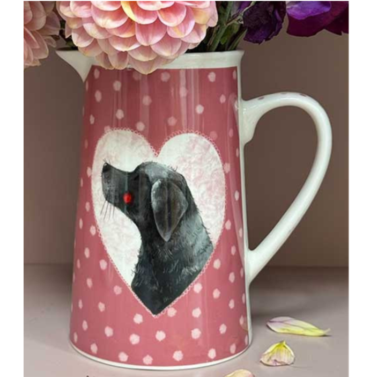 S motivem labradora v srdíčku na tmavě růžovém pozadí, autorkou je anglická malířka Alex Clark, značka Alex Clark Art.