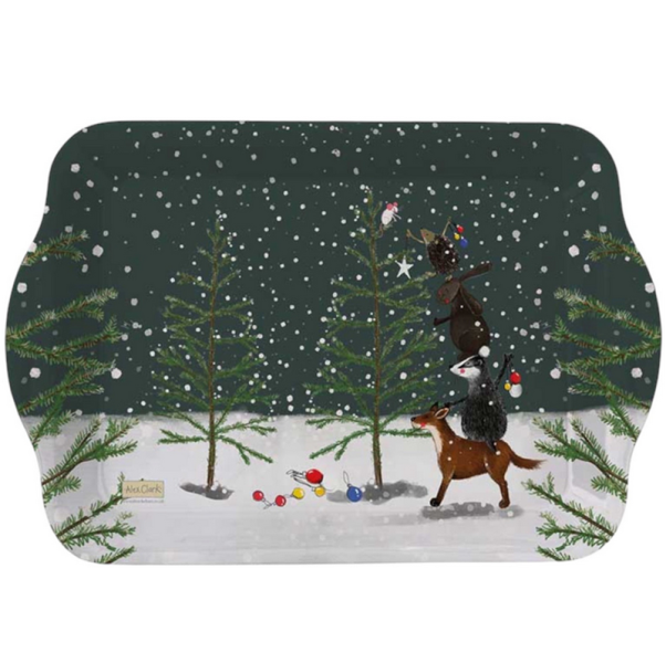Melaminový tácek s vánočním motivem: pes; autorkou je anglická malířka Alex Clark. Není určen pro přímý styk s potravinami. Značka Alex Clark Art.
