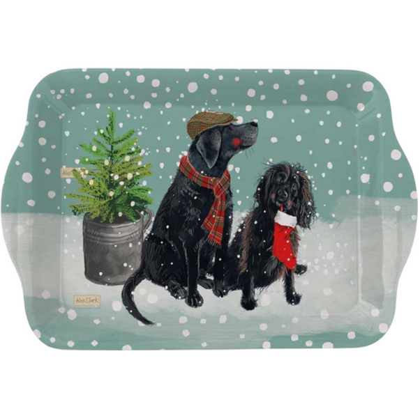 Melaminový tácek s motivem: pes; autorkou je anglická malířka Alex Clark. Není určen pro přímý styk s potravinami. Značka Alex Clark Art.