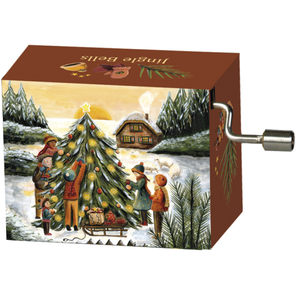 Kovový hrací strojek s kličkou, v papírové krabičce s vánočním obrázkem. Hraje část vánoční písně Rolničky, rolničky.