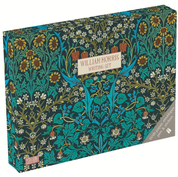 Dopisní papíry, obálky, kuličkové pero a samolepky v krabičce - vše v jednotném motivu Blackthorn od Williama Morrise. Značka Gifted Stationery Company