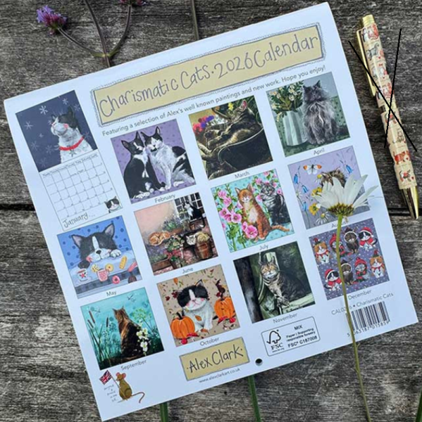 měsíční kalendář na rok 2026, na pověšení, na horní části obrázky koček, na spodní části měsíční kalendář na poznámky, autorkou je anglická malířka Alex Clark, značka Alex Clark Art
