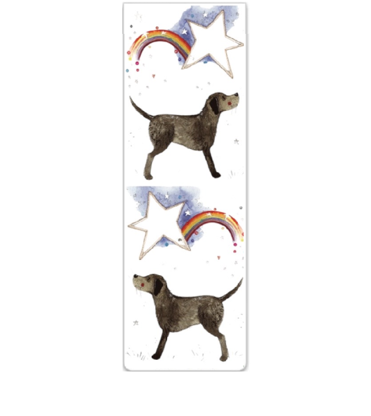 Magnetická záložka do knihy, motiv: pes, duha; autorkou je anglická malířka Alex Clark. Rozložená má rozměr 2,5*16 cm, složená 2,5*8 cm, značka Alex Clark Art.
