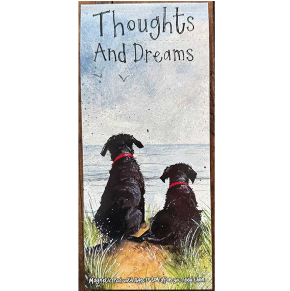 trhací poznámkový bloček s linkovanými listy, na kterých je stejný obrázek jako na titulním obalu; motiv: pes, duny, autorkou je anglická malířka Alex Clark. Rozměr 22,5*10*1 cm, značka Alex Clark Art