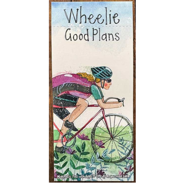trhací poznámkový bloček s linkovanými listy, na kterých je stejný obrázek jako na titulním obalu; motiv: kolo, cyklistka, autorkou je anglická malířka Alex Clark. Rozměr 22,5*10*1 cm, značka Alex Clark Art.