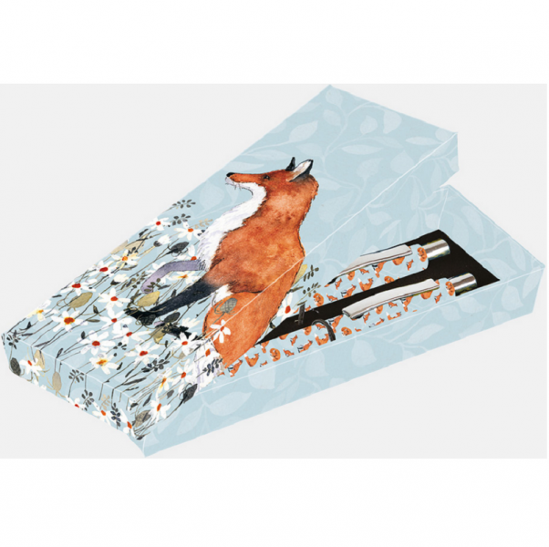 Sada dvou kovových propisek v dárkové krabičce s velkoobsahovou černou náplní, motiv: lišky. Krabička 17,5*6*2,6 cm, značka Gifted Stationery Company
