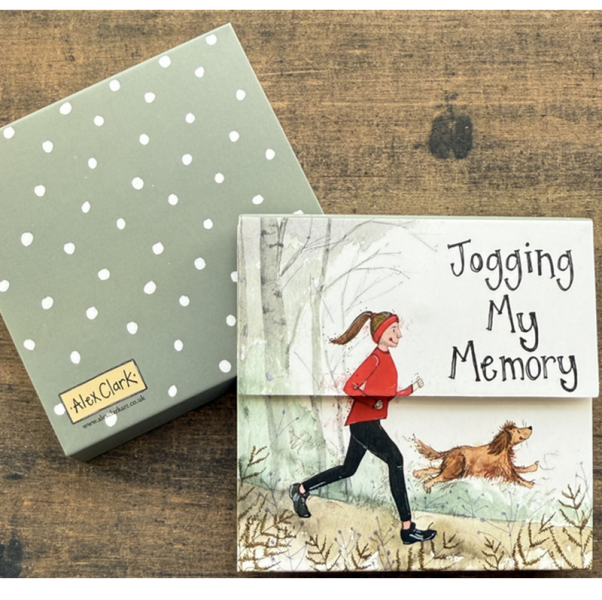 Bloček s trhacími i papírky ve tvrdých deskách, zavírání na magnetku. Motiv: běžkyně; autorkou je anglická malířka Alex Clark, velikost 9*9*1,4 cm, značka Alex Clark Art.