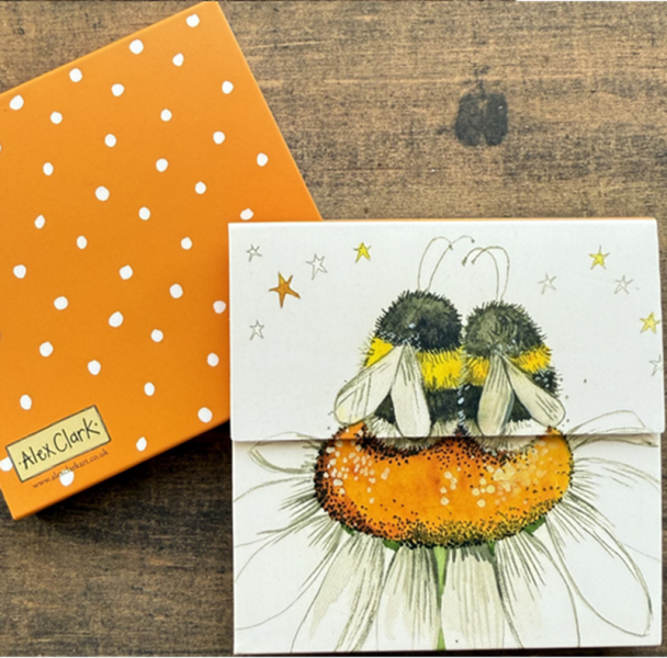 Bloček s trhacími papírky ve tvrdých deskách, zavírání na magnetku. Motiv: včelka, autorkou je anglická malířka Alex Clark, velikost 9*9*1,4 cm, značka Alex Clark Art.