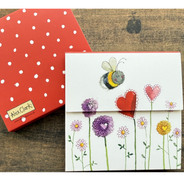 Bloček s trhacími papírky ve tvrdých deskách, zavírání na magnetku. Motiv: včelka; autorkou je anglická malířka Alex Clark, velikost 9*9*1,4 cm, značka Alex Clark Art.
