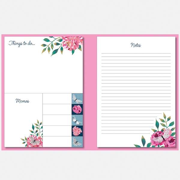 Složka s poznámkovým bločkem na jedné straně a různě velkými lepicími papírky na straně druhé; motiv: motýl. Zn. Gifted Stationery Company