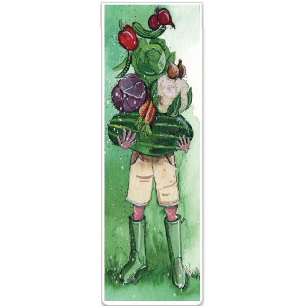 Magnetická záložka do knihy, motiv: zelenina, zahrada; autorkou je anglická malířka Alex Clark. Rozložená má rozměr 2,5*16 cm, složená 2,5*8 cm, značka Alex Clark Art.