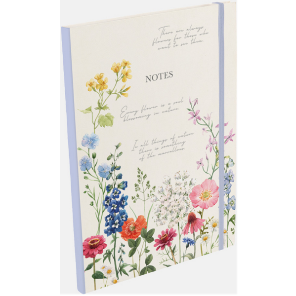 Zápisník s pružnou šitou vazbou má 176 listů bílého linkovaného papíru, gumička brání otevření zápisníku. Motiv: květiny. Značka Gifted Stationery Company