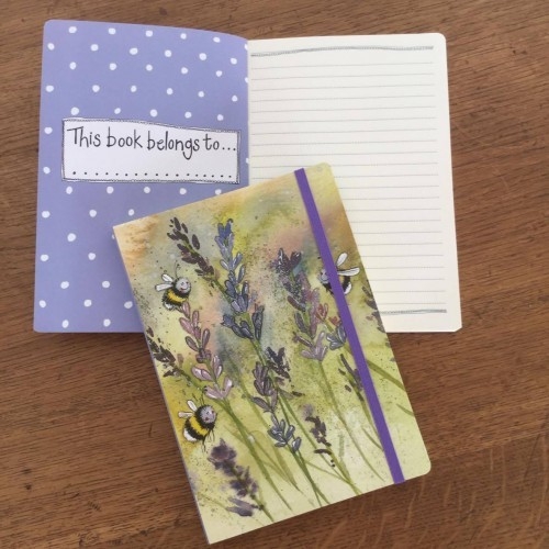 Velký tlustý linkovaný zápisník s měkkými deskami a gumičkou, která brání otevření zápisníku. Na přední desce uvnitř je text "This book belongs to ...". S motivem: levandule, včelka; autorkou je anglická malířka Alex Clark. Rozměr 21*15*1 cm, značka Alex Clark Art.