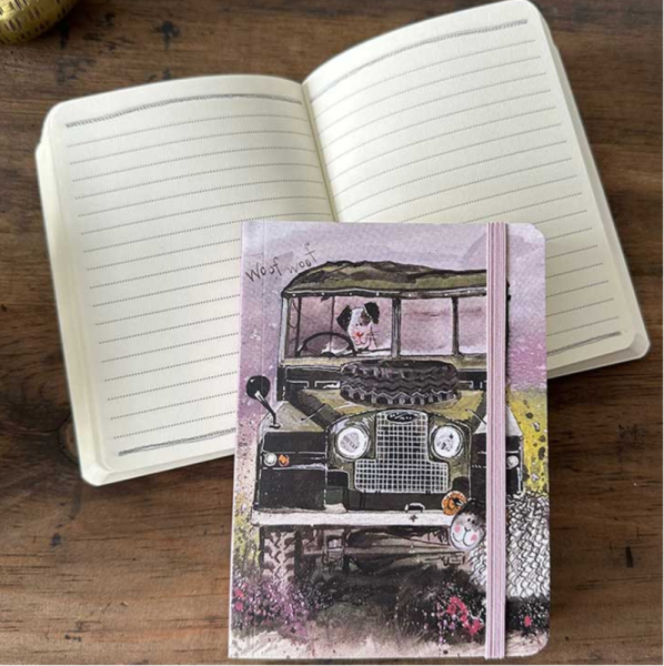 Malý tlustý linkovaný zápisník s měkkými deskami a gumičkou, která brání otevření zápisníku. Na přední desce uvnitř je text "This book belongs to ...". S motivem: pes - španiel, autorkou je anglická malířka Alex Clark. Rozměr 14*10,5*1,7 cm, značka Alex Clark Art.