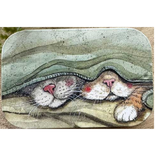 Plechová dózička s posuvným víkem, uvnitř nedělená. Vhodná na léky nebo malé bonbonky, motiv: kočka; autorkou je anglická malířka Alex Clark, zn. ALex Clark Art