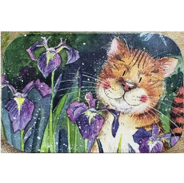 Plechová dózička s posuvným víkem, uvnitř nedělená. Vhodná na léky nebo malé bonbonky, motiv: kočka, kosatce; autorkou je anglická malířka Alex Clark, zn. ALex Clark Art