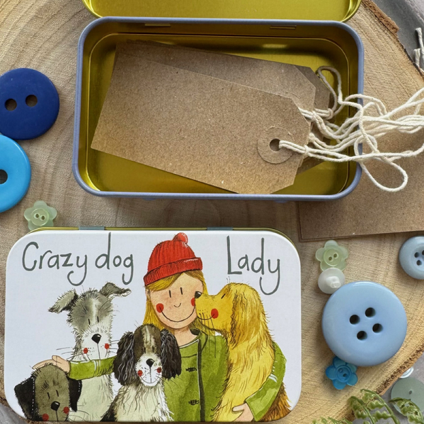 Plechová dóza vhodná jako obal na mýdlo, pralinky či jiné drobnosti, motiv: pes, dívka, zn. Alex Clark Art