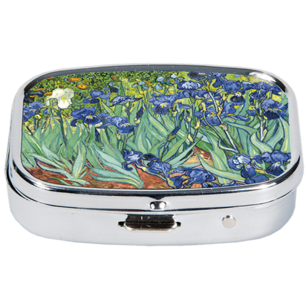 Kovová dózička na léky s pantem. Uvnitř se zrcátkem a dělenou plastovou vložkou. Povrch obrázku je ze syntetické pryskyřice. S motivem obrazu Irises, jehož autorem je nizozemský malíř Vincent van Gogh.