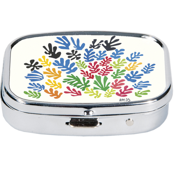 Kovová dózička na léky s pantem. Uvnitř se zrcátkem a dělenou plastovou vložkou. Povrch obrázku je ze syntetické pryskyřice. Motiv obrazu Snop od francouzského malíře, sochaře a grafika Henri-Émile-Benoit Matisse (1869 - 1954).