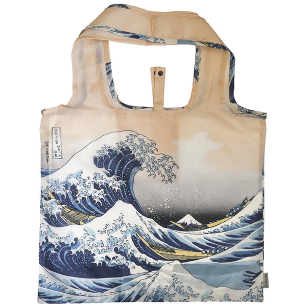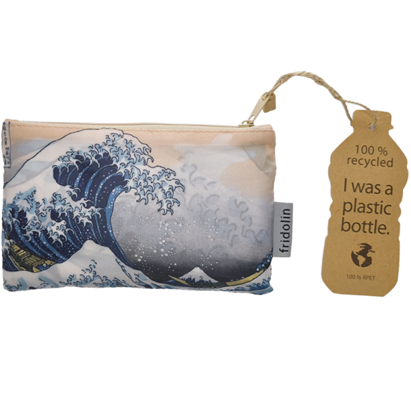 Nákupní taška ze 100% recyklovaného materiálu, která se lehce složí do malého pouzdra se zipem. Pouzdro je sundávací, lze ho použít i jako malou peněženku. V tašce je vnitřní kapsička všitá do horního lemu tašky. Do lemu jsou také všity 2 proužky s drukem, které slouží k rychlému sepnutí složené a srolované tašky. S motivem obrazu The Great Wave od japonského umělce, malíře a dřevorytce Kacušika Hokusaie (1760 – 1849).